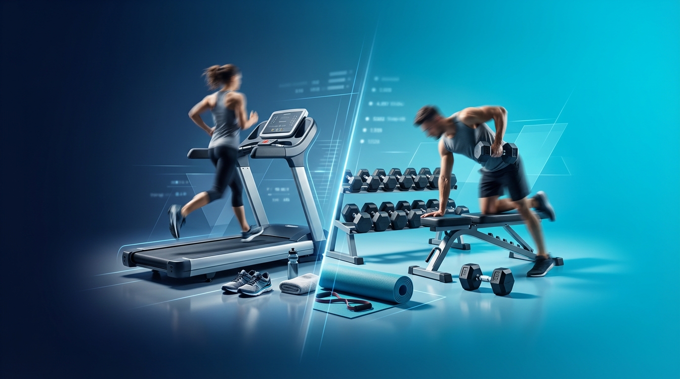 [画像: ジムでダンベルトレーニングとランニングマシンの写真]